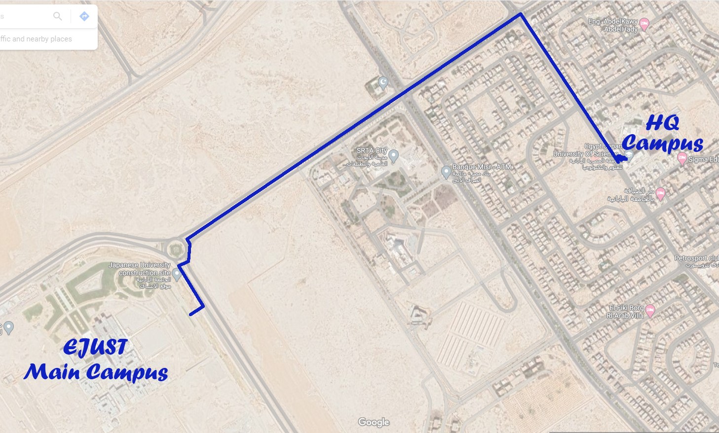 EJUST has launched a policy in cooperation with New Borg Elarab authority to upgrade the city streets based on the complete street policies by adding a dedicated bike lane between E-JUST main campus and HQ campus (about 3 Km) and facilitating 100 bicycles for moving between the both campuses (Figure 1).